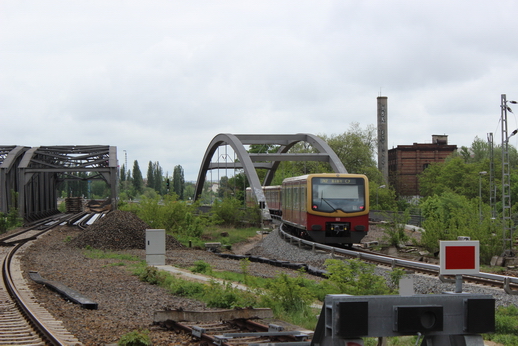 Die Ringbahn Richtung Ostkreuz verlässt den S-Bhaf. Am Treptower Park über die neue Brücke, die später die Fernverkehrsgleise aufnehmen wird.