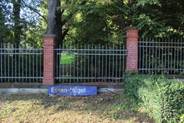 Im Haltepunkt "Essen-Hügel" bei den fast abgeschlossenen Bauarbeiten übig gebliebenes Stationsschild.