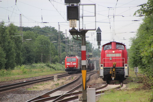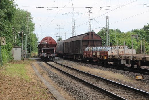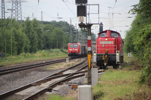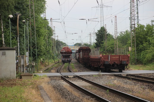 Während sich auf dem Richtungsgleis in Richtung Düsseldorf ein Güterzug nähert, setzt sich der auf dem linken Ausweichgleis abgestellte Güterzug in Bewegung.