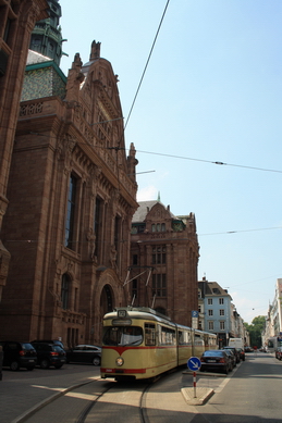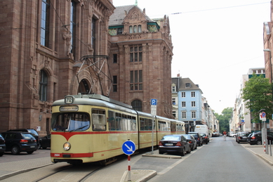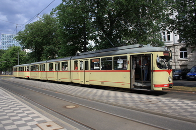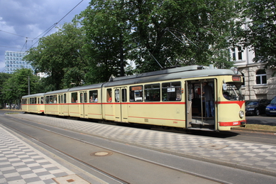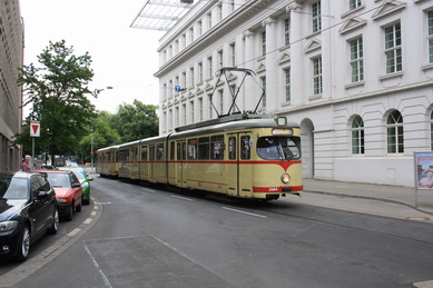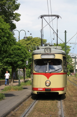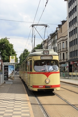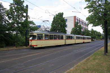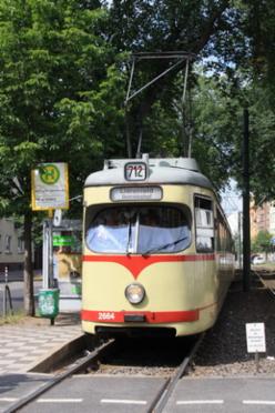 Alle Teilnehmer der Fahrt waren jetzt im GT8 TW 2664 und dem BW 1679. Hinter dem Linienwagen ging es dann in Richtung Innenstadt, am Jan-Wellen-Platz ließen wir den Wagen der Linie 712 vor.