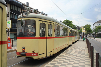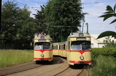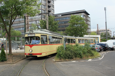 Vom Strassenbahnhof "Am Steinberg" ging es Richtung Düsseldorf-Rath. Dabei fuhr der GT6 TW 2432 mit BW 1679 voran, gefolgt von GT8 TW 2664.