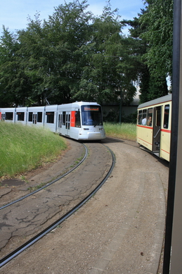 Der nächste Fotohalt war zwischen den Haltestellen "Graf-Recke-Str." und "Mörsenbroicher Weg" auf dem eigenen Bahnkörper.