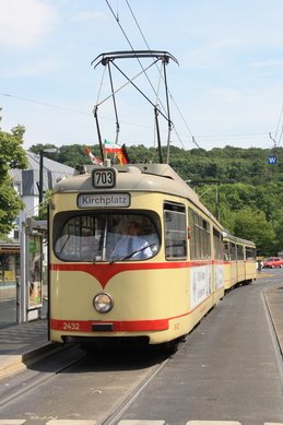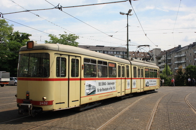 Der GT6 TW Nr. 2432 fährt als erster in Gerresheim ab ...