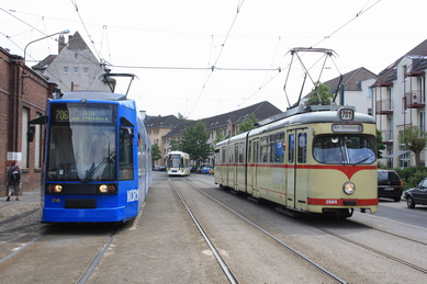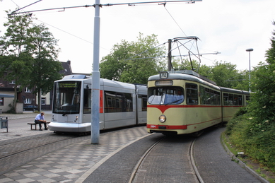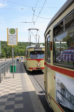 Nach kurzer Überlegung stellt man fest, dass der GT8 auf dem Stumpfgleis nicht davor passt - der nächste Linienwagen steht bereits dahinter - so dass jatzt alles ziemlich schnell gehen muss. Der GT6 TW 2432 wird also den BW 1679 stehen lassen und gleich in Richtung Innenstadt wieder starten, so dass er den Lienienwagen nicht behindert, wenn dieser die Schleife befahren kann, wenn der GT( TW 2664 auf das Stumpfgleis gefahren ist.