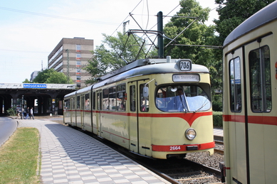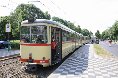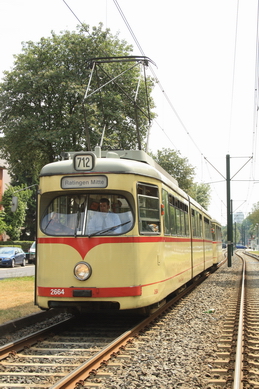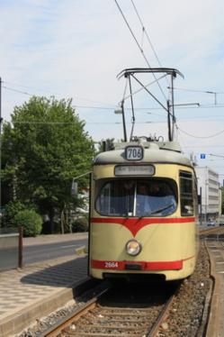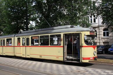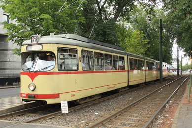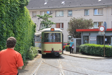 Nach der pünklichen Abfahrt am Hauptbahnhof (leider habe ich da keine Bilder gemacht) ging es zunächst in Richtung Gerresheim. Als erster Wagen fährt der GT8 TW Nr. 2664 und als zweiter Wagen der GT6 TW Nr. 2432, den Beiwagen werden wir erst im Bhf "Am Steinberg" mitnehmen.