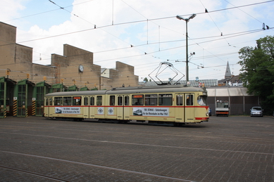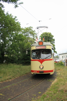 Der GT6 TW Nr. 2432 ist durch die Wagenhalle gefahren und steht jetzt vor der Wagenhalle vom Strassenbahnhof "Am Steinberg".