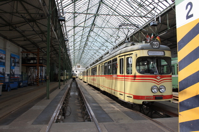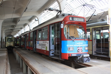 In der Wagenhalle steht die Partybahn TW Nr. 2498 mit einem Gro0raumbeiwagen ...