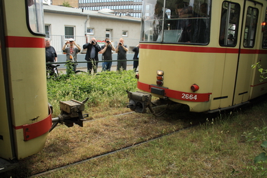In der Enhaltestelle "Düsseldorf-Rath" sollt durch Rangieren auf den vorhandenen Gleisstumpf der BW 1679 umgekuppelt werden, d.h. der GT8 TW 2664 soll den BW 1679 übernehmen.