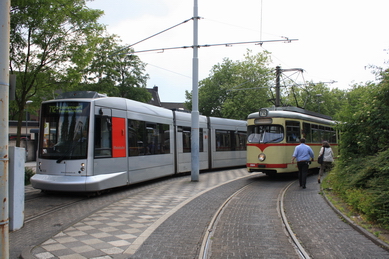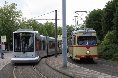 Bei der Ankunft in der Endhaltestelle "Ratingen-Mitte" fahren wir auf dem Innengleis neben den Planwagen der Linie 712.